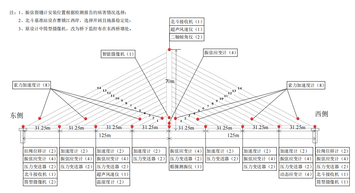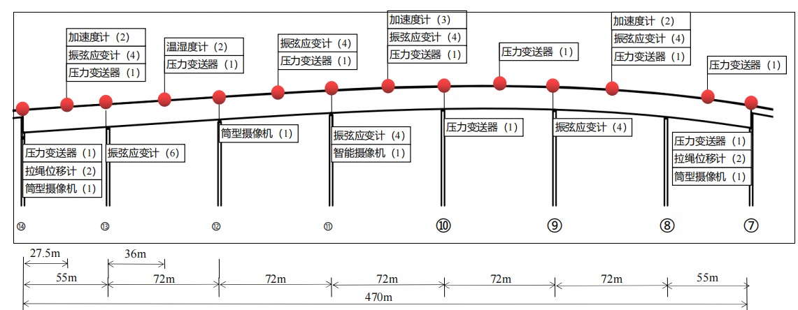 本項(xiàng)目主要提供整座橋梁的健康監(jiān)測,所用設(shè)備包括低頻振動(dòng)傳感器、拉線位移計(jì)、風(fēng)速風(fēng)向儀、溫濕度計(jì)、差壓變送器、監(jiān)控?cái)z像頭、硬盤錄像機(jī)、動(dòng)態(tài)數(shù)據(jù)采集儀、電流數(shù)據(jù)采集儀、工控機(jī)、交換機(jī)、服務(wù)器、BY-IPCS監(jiān)測軟件,并且負(fù)責(zé)項(xiàng)目安裝實(shí)施和系統(tǒng)調(diào)試。