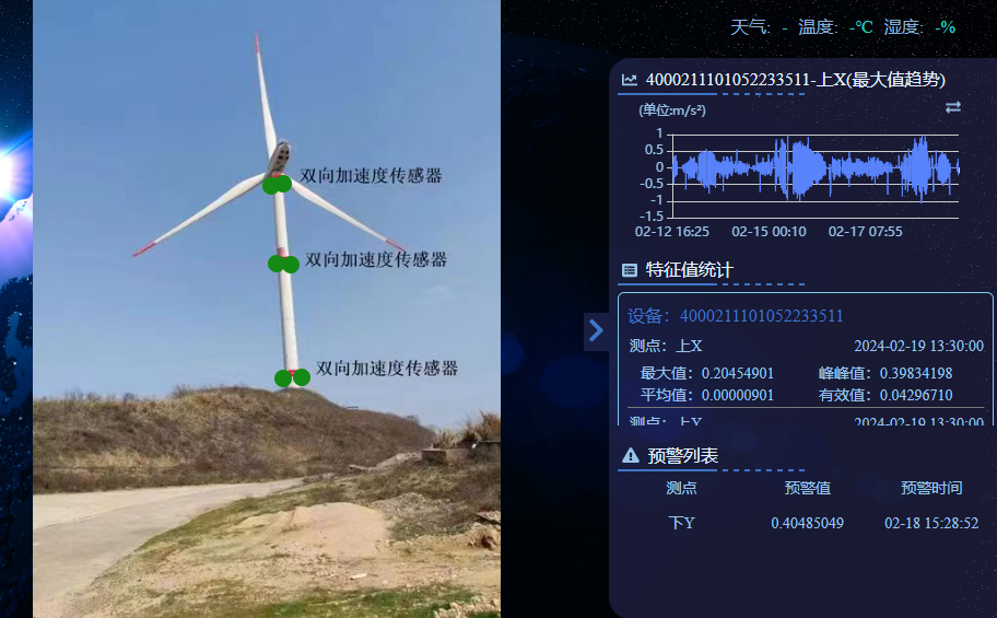 該項(xiàng)目位于江西,項(xiàng)目總裝機(jī)容量9.6萬(wàn)千瓦,采用先進(jìn)的2MW風(fēng)機(jī)。項(xiàng)目建成后,每年可以為電網(wǎng)提供2億度電量,每年可以解決標(biāo)煤7萬(wàn)噸,減少二氧化碳排放16萬(wàn)噸。長(zhǎng)期以來(lái),振動(dòng)是風(fēng)力發(fā)電機(jī)組運(yùn)行中最常見(jiàn)的主要故障之一,又是原因最復(fù)雜、最不容易解決的問(wèn)題,嚴(yán)重時(shí)會(huì)形成振動(dòng)事故,造成設(shè)備損害。風(fēng)力發(fā)電機(jī)運(yùn)行是否正常直接影響著風(fēng)力發(fā)電的產(chǎn)量,風(fēng)機(jī)故障可能會(huì)導(dǎo)致機(jī)組本身的損壞,甚至有可能造成更嚴(yán)重的后果,因此風(fēng)機(jī)的監(jiān)測(cè)顯得尤為重要。