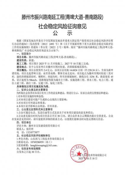 滕州市振興路南延工程(青啤大道-善南路段)社會穩(wěn)定風(fēng)險征詢意見公示