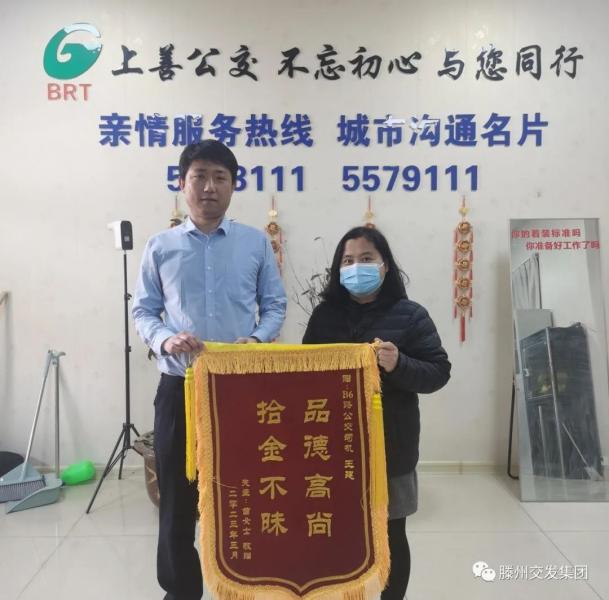 原來,苗女士在乘坐BRT-B6線路時(shí),不慎將手機(jī)遺落在車輛上,下車后,才發(fā)現(xiàn)手機(jī)丟失,萬分著急的苗女士趕忙來到上善公交調(diào)度中心,尋求幫助。工作人員聽完苗女士的敘述后,迅速通過調(diào)度平臺(tái)向B6線所有車輛下發(fā)了尋物信息。此時(shí),行駛至B6薛城換乘中心清掃車內(nèi)衛(wèi)生的駕駛員王建也發(fā)現(xiàn)了車廂后部?jī)?nèi)側(cè)座位上的這部手機(jī),正準(zhǔn)備打電話將情況報(bào)送給調(diào)度中心。1個(gè)小時(shí)后,王建師傅從BRT薛城換乘中心趕到滕州換乘中心,并將手機(jī)交到苗女士手中。為表示感謝,苗女士特意定制了一面錦旗,專程來到調(diào)度中心,表達(dá)由衷的謝意。