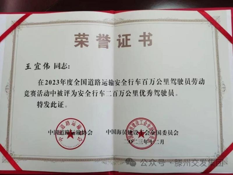 近日,在2023年度全國道路運(yùn)輸安全行車百萬公里駕駛員勞動競賽活動中,我省共有9名駕駛員獲得“全國道路運(yùn)輸安全行車二百萬公里優(yōu)秀駕駛員”榮譽(yù)稱號,其中滕州市交通發(fā)展集團(tuán)國運(yùn)公司駕駛員王宜偉也獲此殊榮。