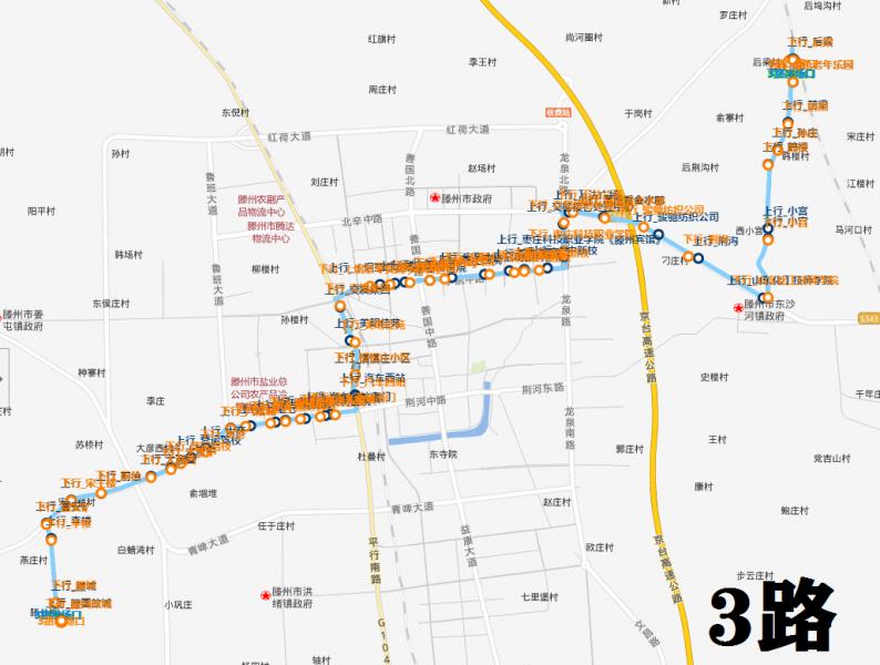 為進(jìn)一步增強(qiáng)公交線網(wǎng)的覆蓋率,暢通我市東西部交通出行,1989年12月14日,3路公交線路開通運(yùn)營五里屯—東沙河鎮(zhèn)政府。隨著我市經(jīng)濟(jì)社會(huì)的快速發(fā)展,群眾的交通需求不斷變化,3路線路經(jīng)歷了多次調(diào)整。1994年,運(yùn)營線路調(diào)整為火車站—東沙河鎮(zhèn)政府。1998年又恢復(fù)了3路五里屯—東沙河鎮(zhèn)政府。1999年調(diào)整為火車站—東沙河鎮(zhèn)政府延伸至十六中。1999年10月3路延伸至前梁村。2004年8月4日,3路經(jīng)韓樓村分支運(yùn)營至耿樓村。2006年8月9日,3路線分支運(yùn)營的耿樓村延伸至滕州與山亭交界的宋莊村,形成了3路線末端分支運(yùn)營格局。2006年9月27日,3路調(diào)整為火車站—平行路—龍山路—龍泉北路—北留路—東沙河—前梁分支運(yùn)營。2015年12月29日,為方便滕國故城附近群眾出行,經(jīng)上級(jí)領(lǐng)導(dǎo)部門批準(zhǔn),優(yōu)化調(diào)整3路走向,填補(bǔ)滕國故城等路段公交空白,延伸至滕國故城,由前梁發(fā)車途經(jīng)北辛路、龍泉路、學(xué)院路、平行路、荊河路發(fā)往滕國故城方向,全程23km,票價(jià)2元。2017年1月1日起,3路公交車由有人售票改為無人售票,票價(jià)2元。